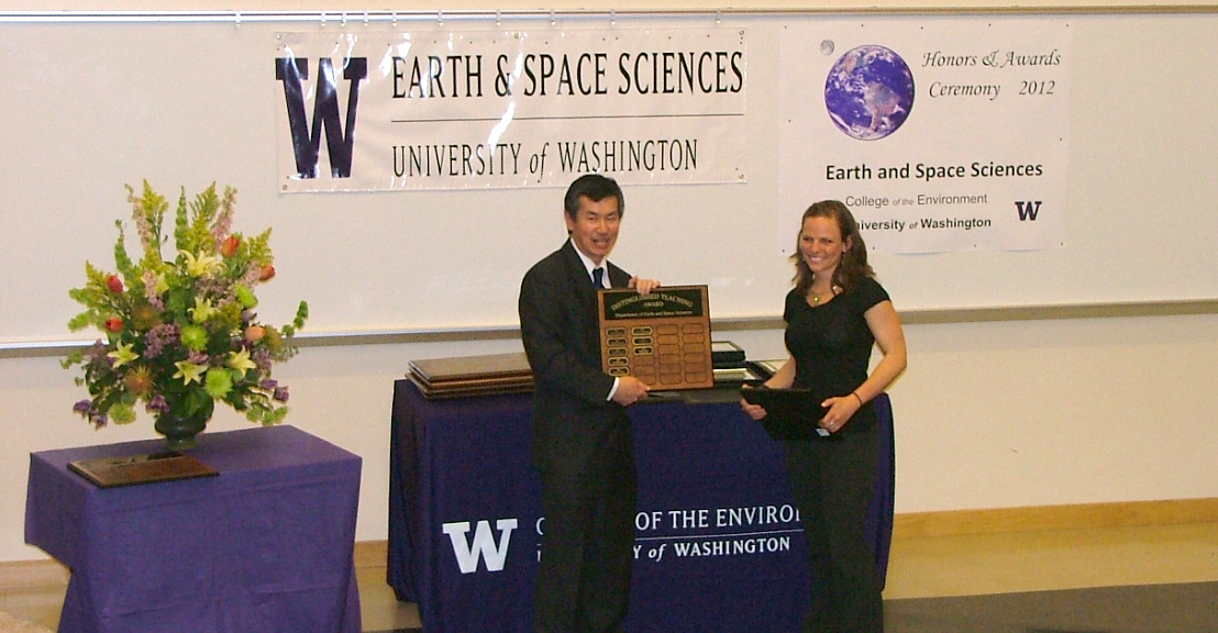 Brittany Brand receiving the Bassett Faculty Teaching Excellence Award from Robert Winglee. ( Missing from photo : Gerard Roe )