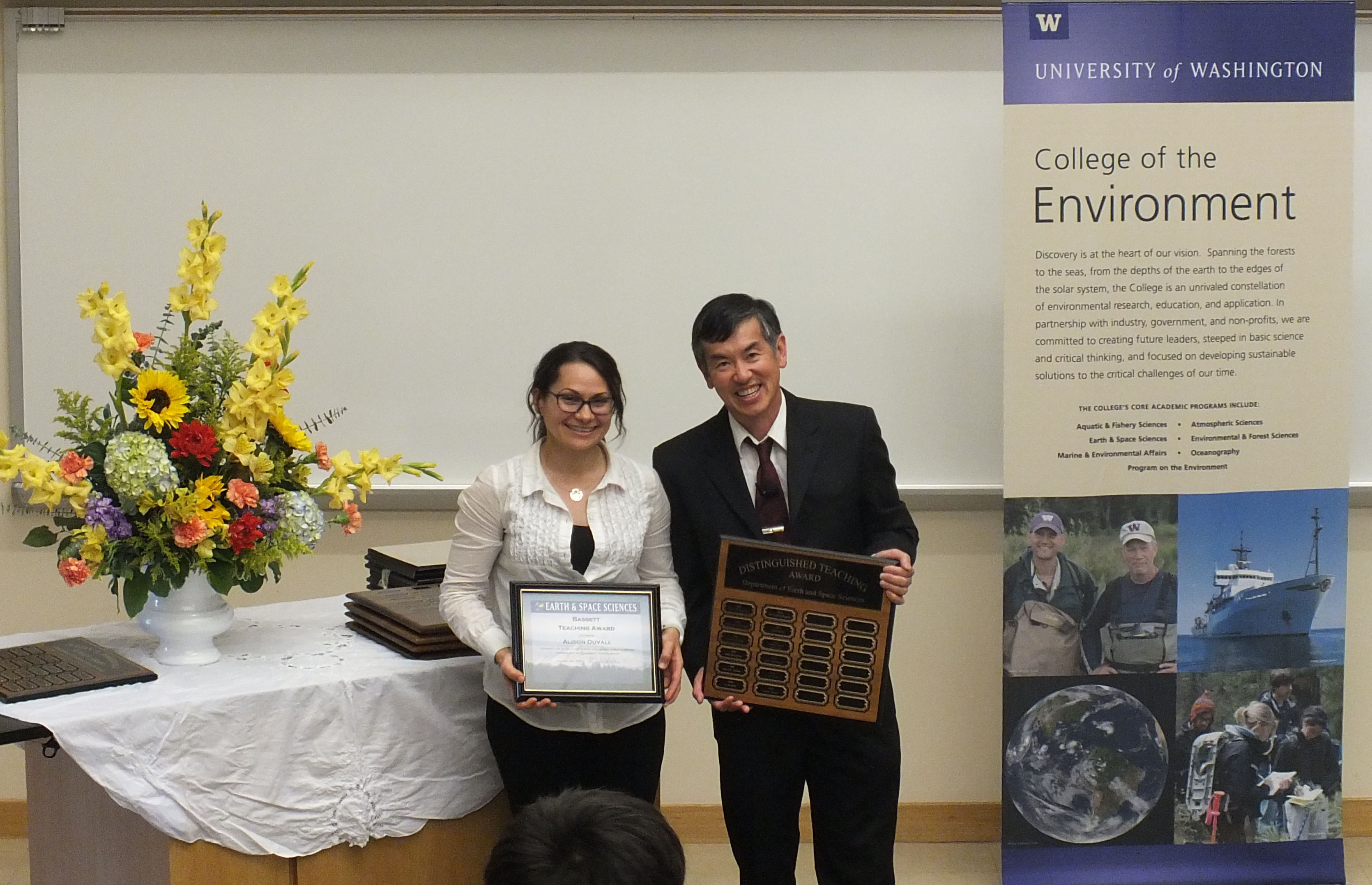 Alison Duvall receiving the Bassett Faculty Teaching Excellence Award from Robert Winglee.