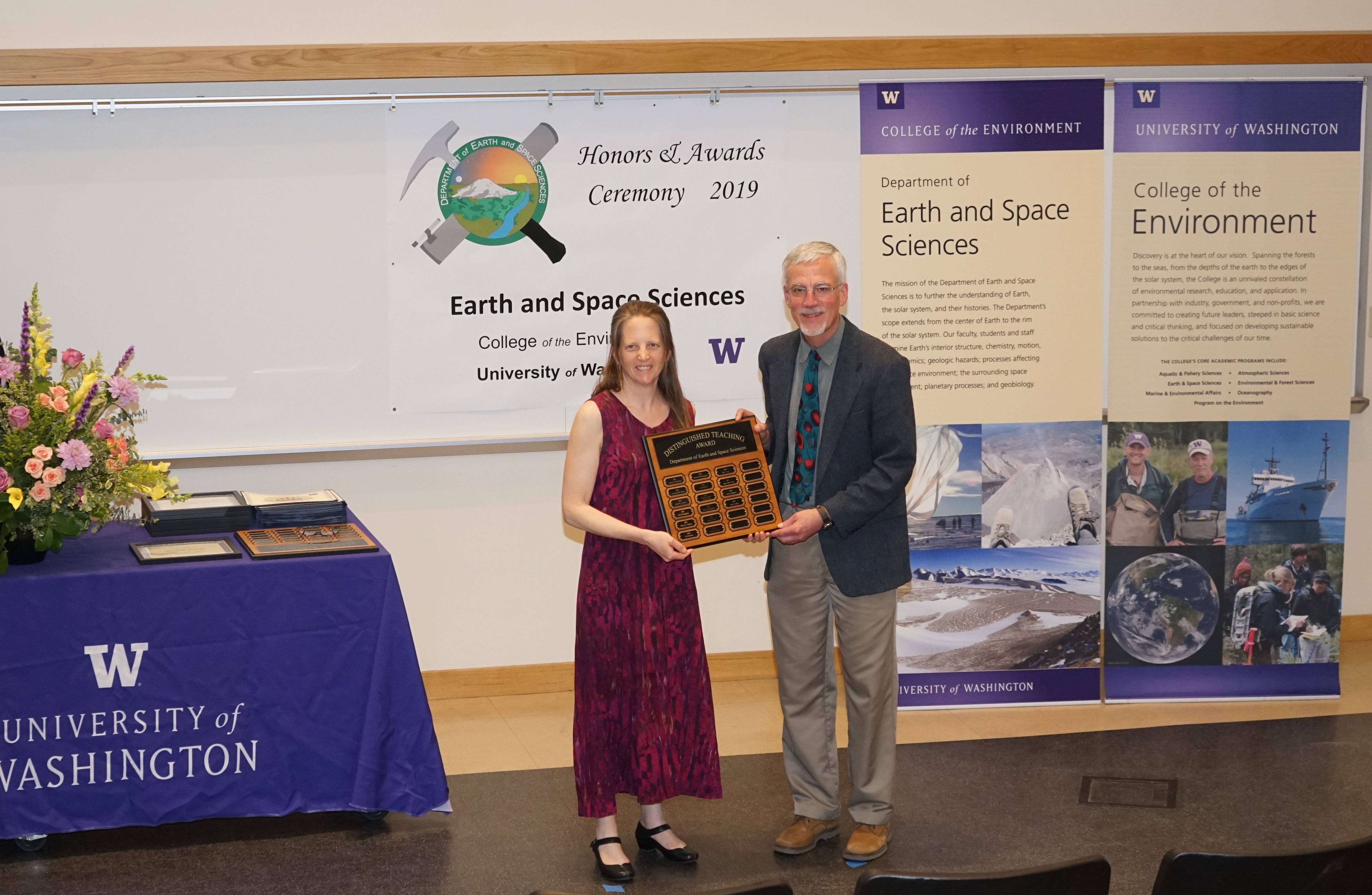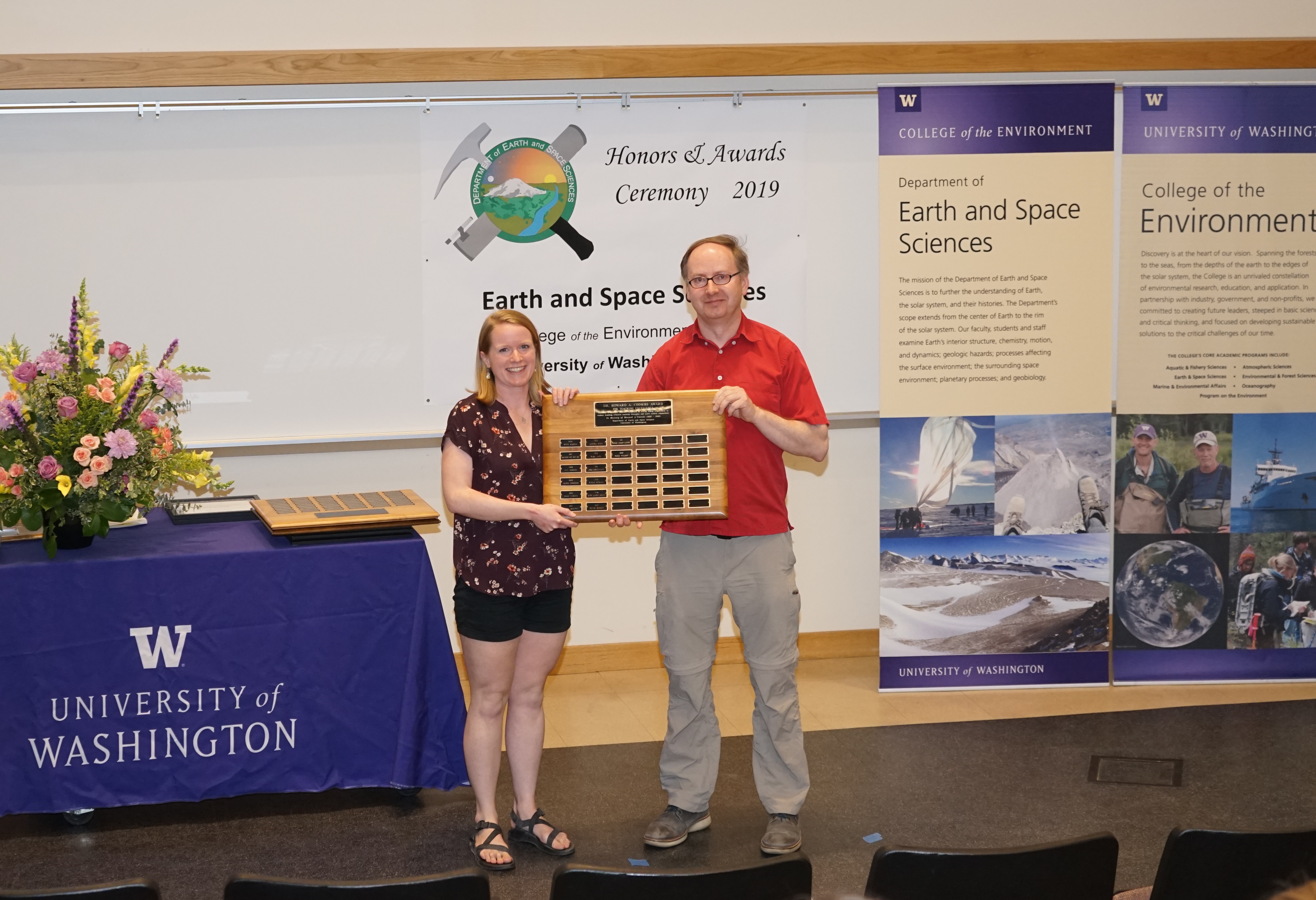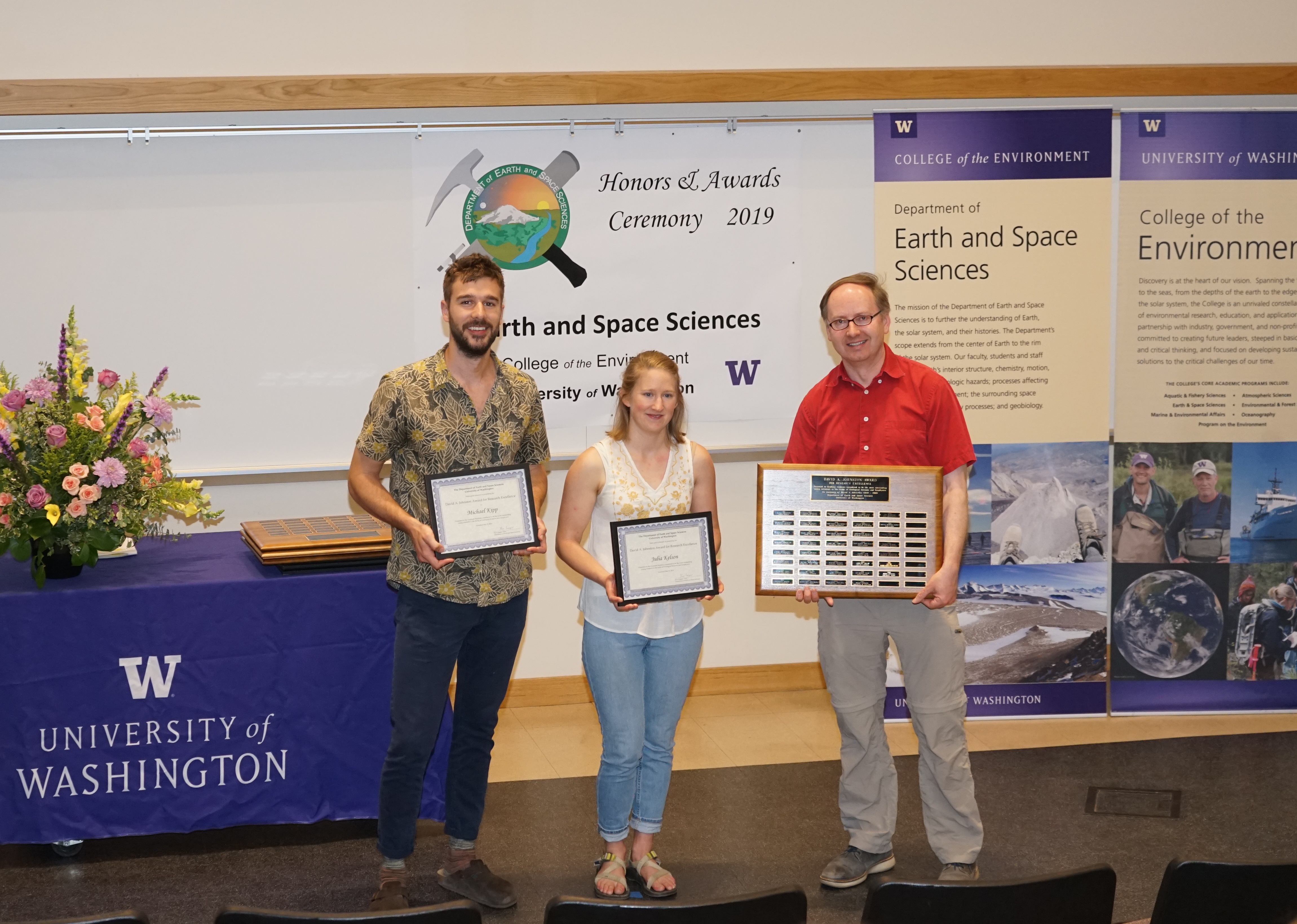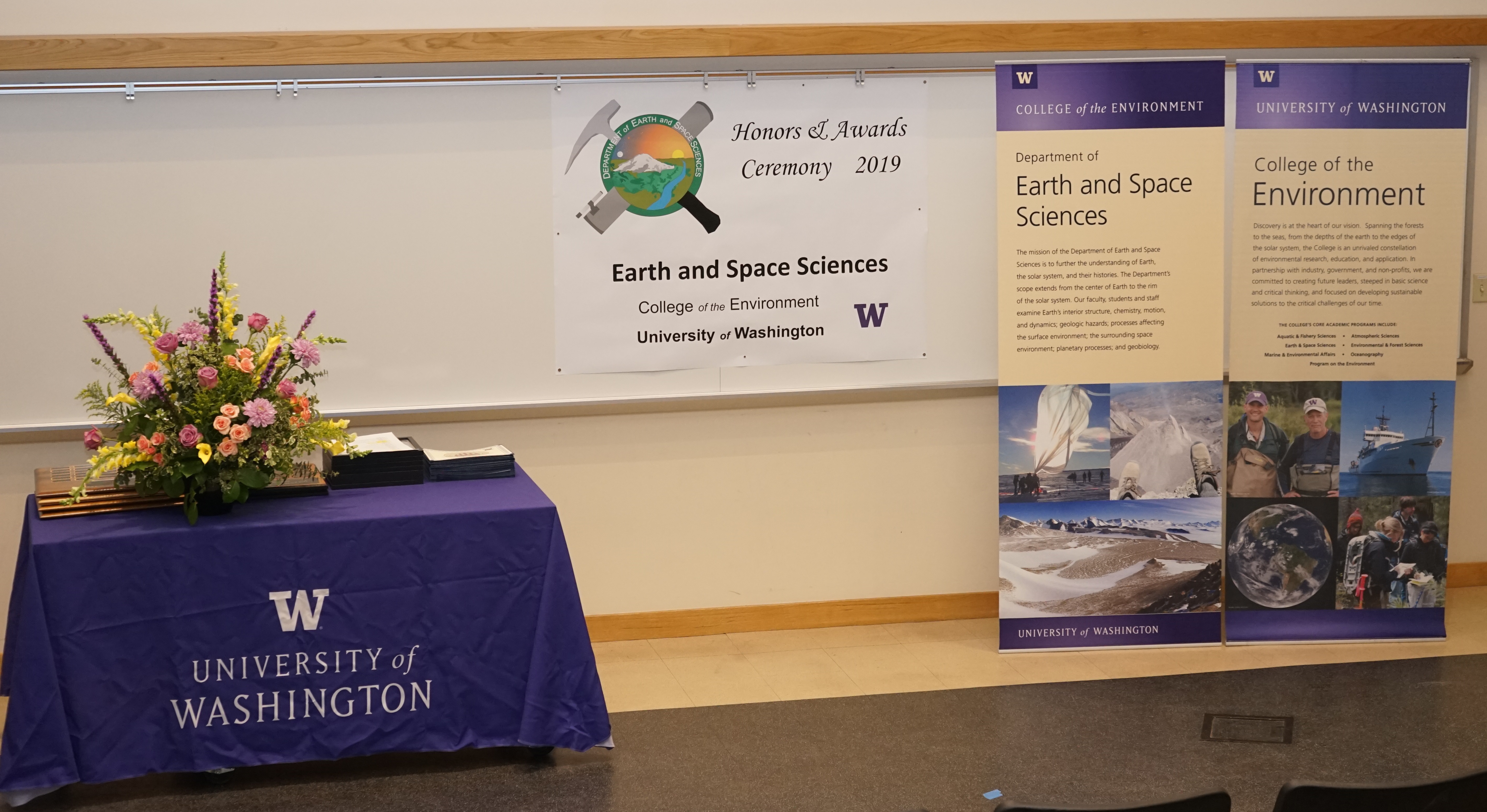 The 2019 UW Dept of Earth and Space Sciences Honors and Awards Ceremony was held on Friday, May 12 at 3:30 PM in JHN-102, hosted by ESS Chair Ken Creager. There were numerous honors, awards, and scholarships given during this ceremony before adjourning to a reception in the Johnson Hall Courtyard.