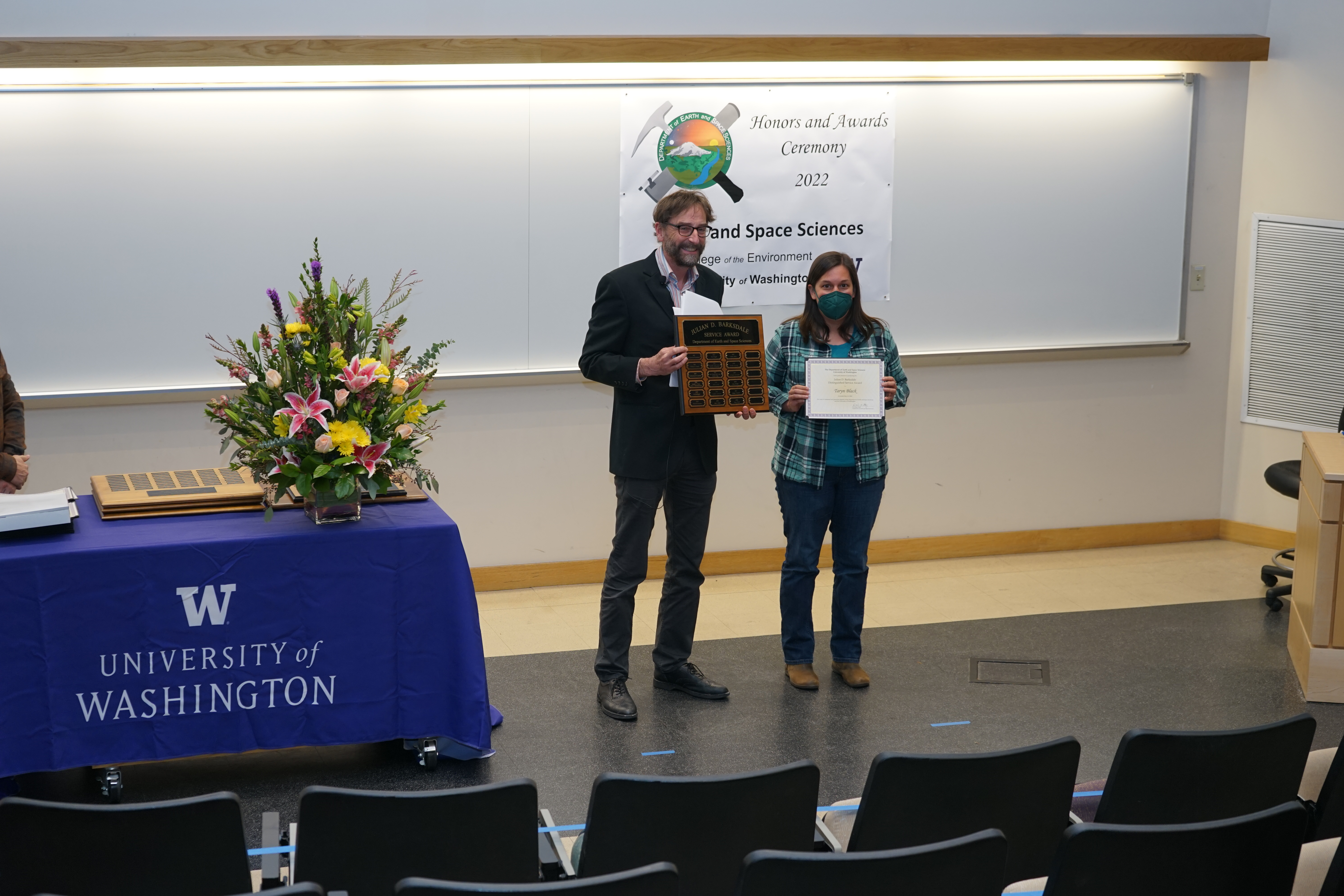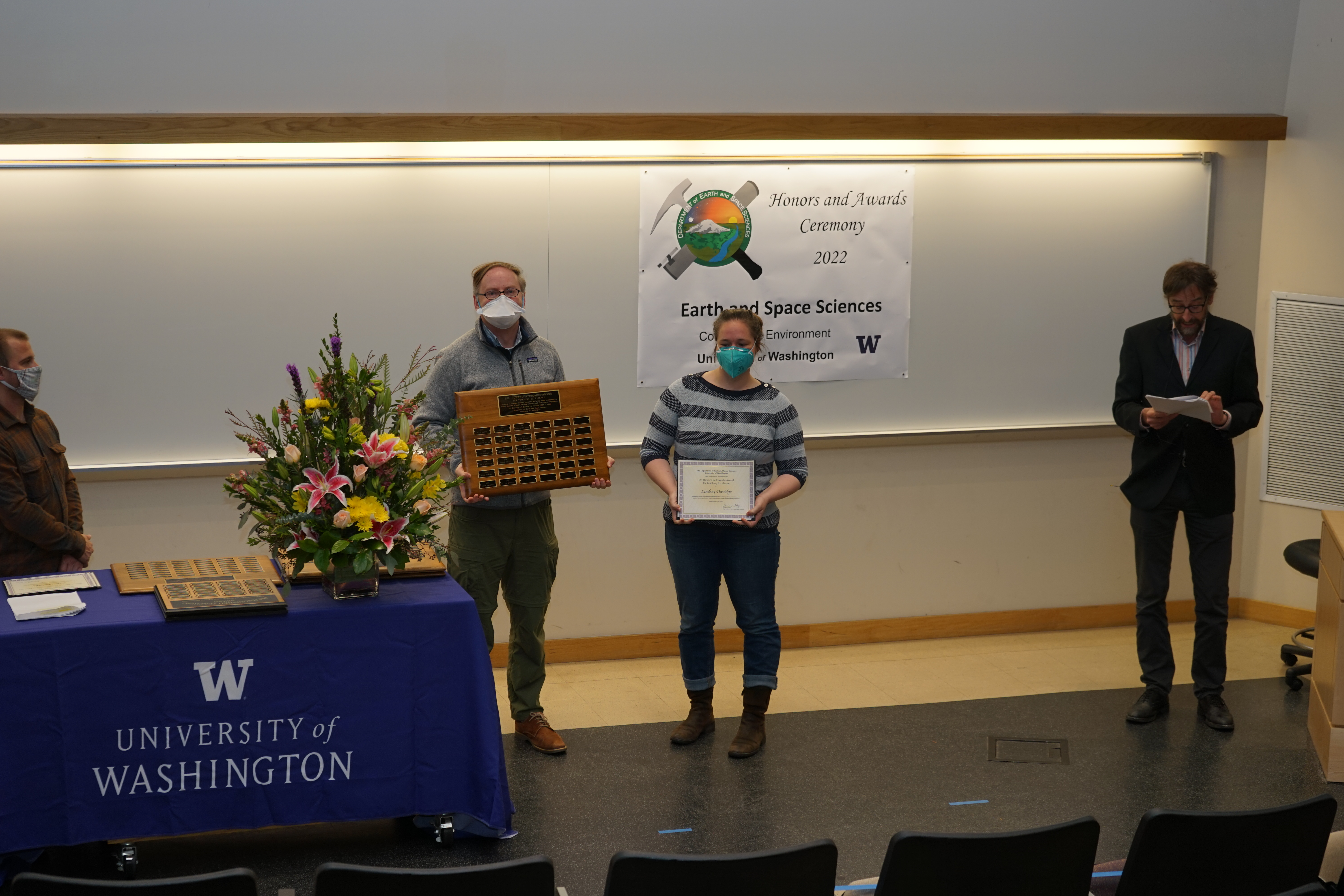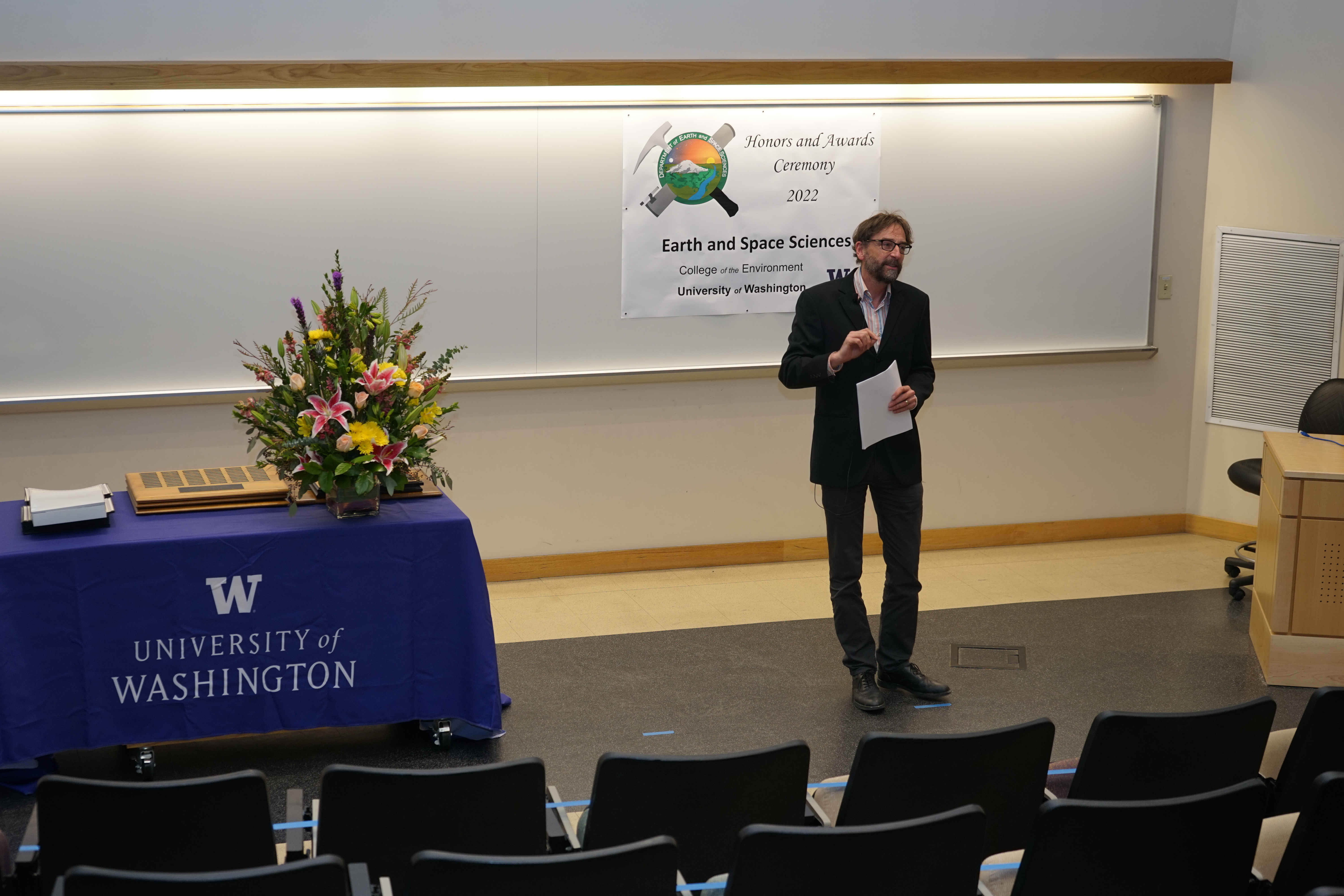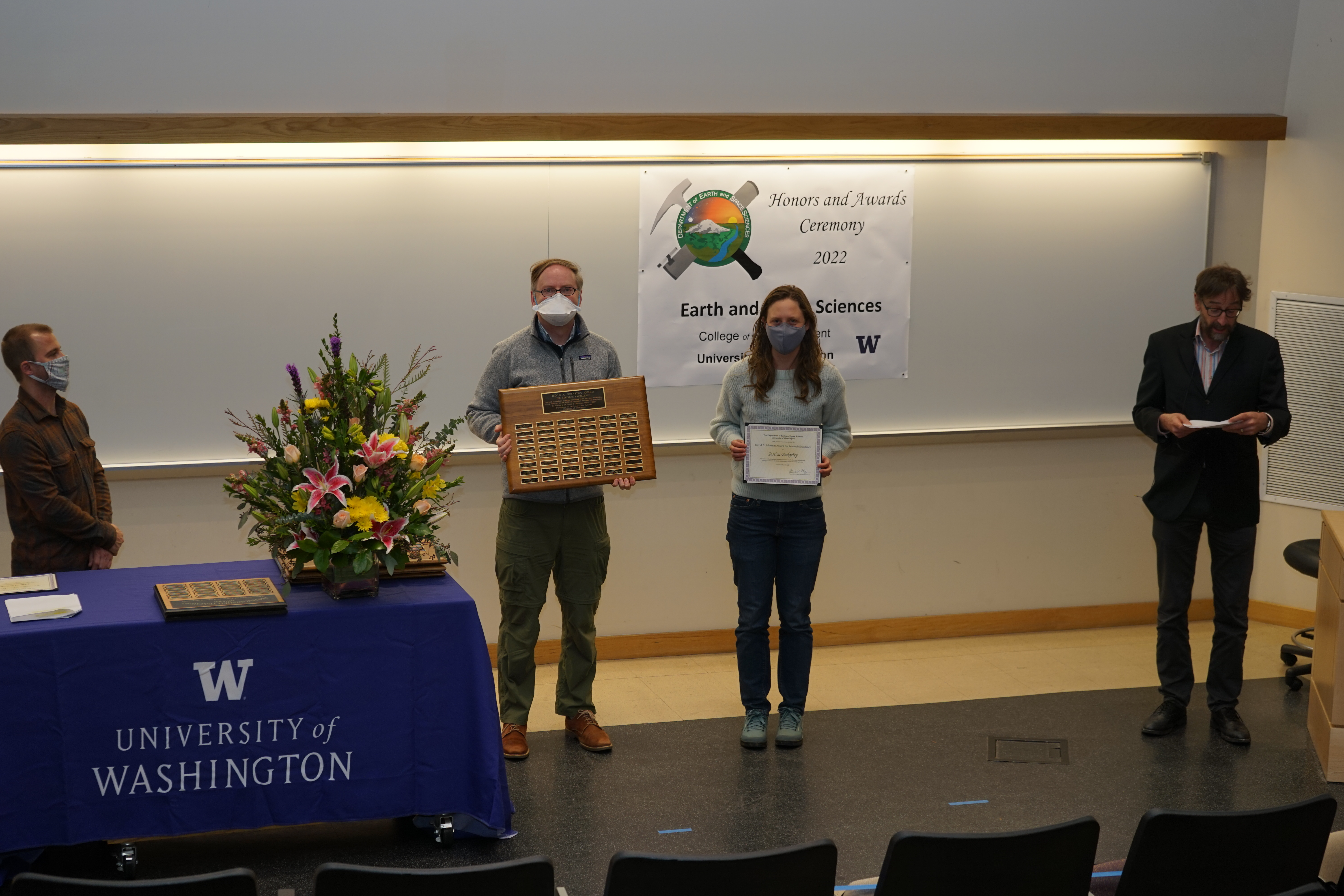 The 2022 UW Dept of Earth and Space Sciences Honors and Awards Ceremony was held on Friday, May 12 at 3:30 PM in JHN-102, hosted by ESS Chair Eric Steig. There were numerous honors, awards, and scholarships given during this ceremony before adjourning to a reception in the Johnson Hall Courtyard.