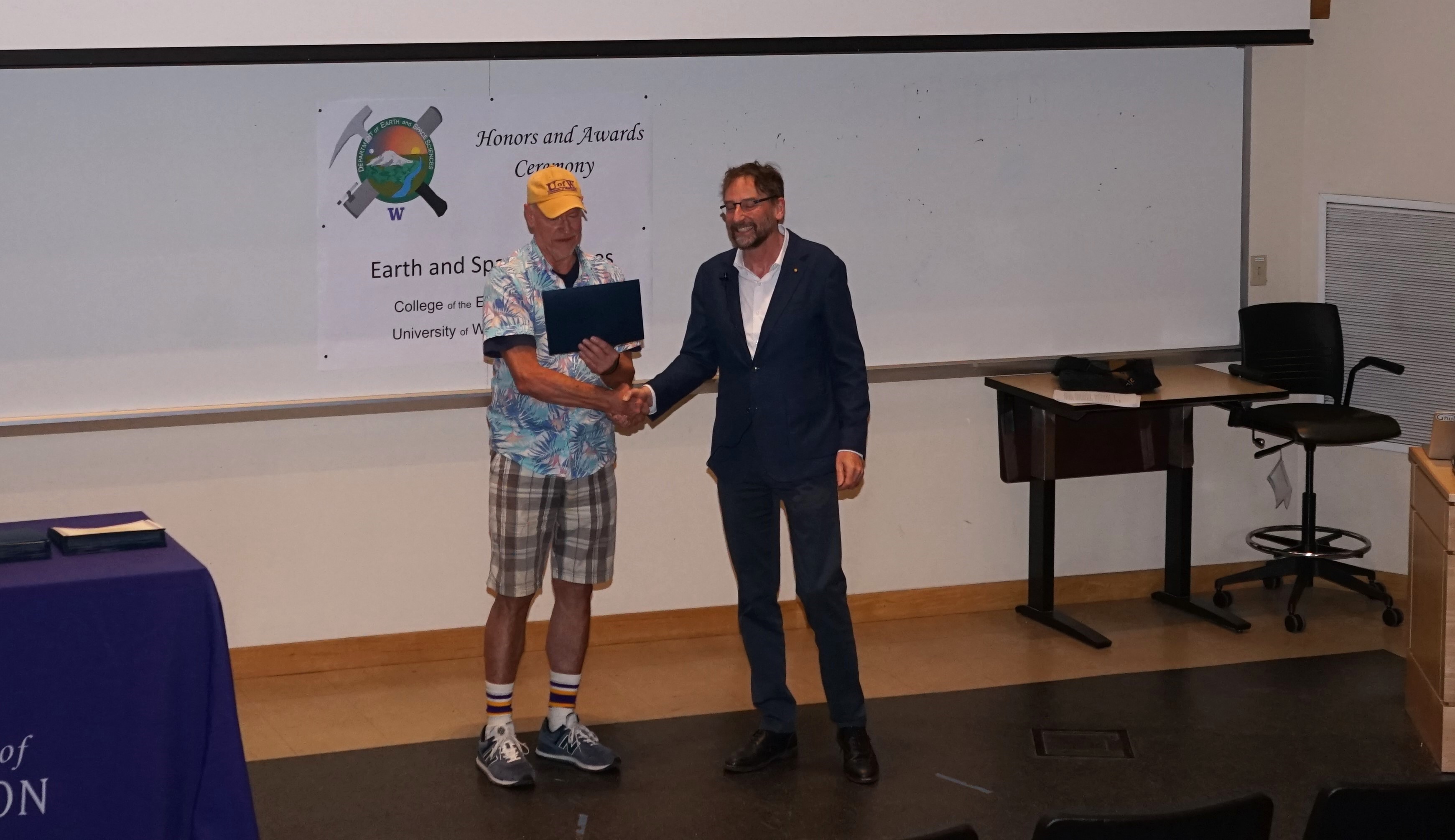 The 2024 UW Dept of Earth and Space Sciences Honors and Awards Ceremony was held on Friday, May 12 at 3:30 PM in JHN-102, hosted by ESS Chair Eric Steig. There were numerous honors, awards, and scholarships given during this ceremony before adjourning to a reception in the Johnson Hall Courtyard.