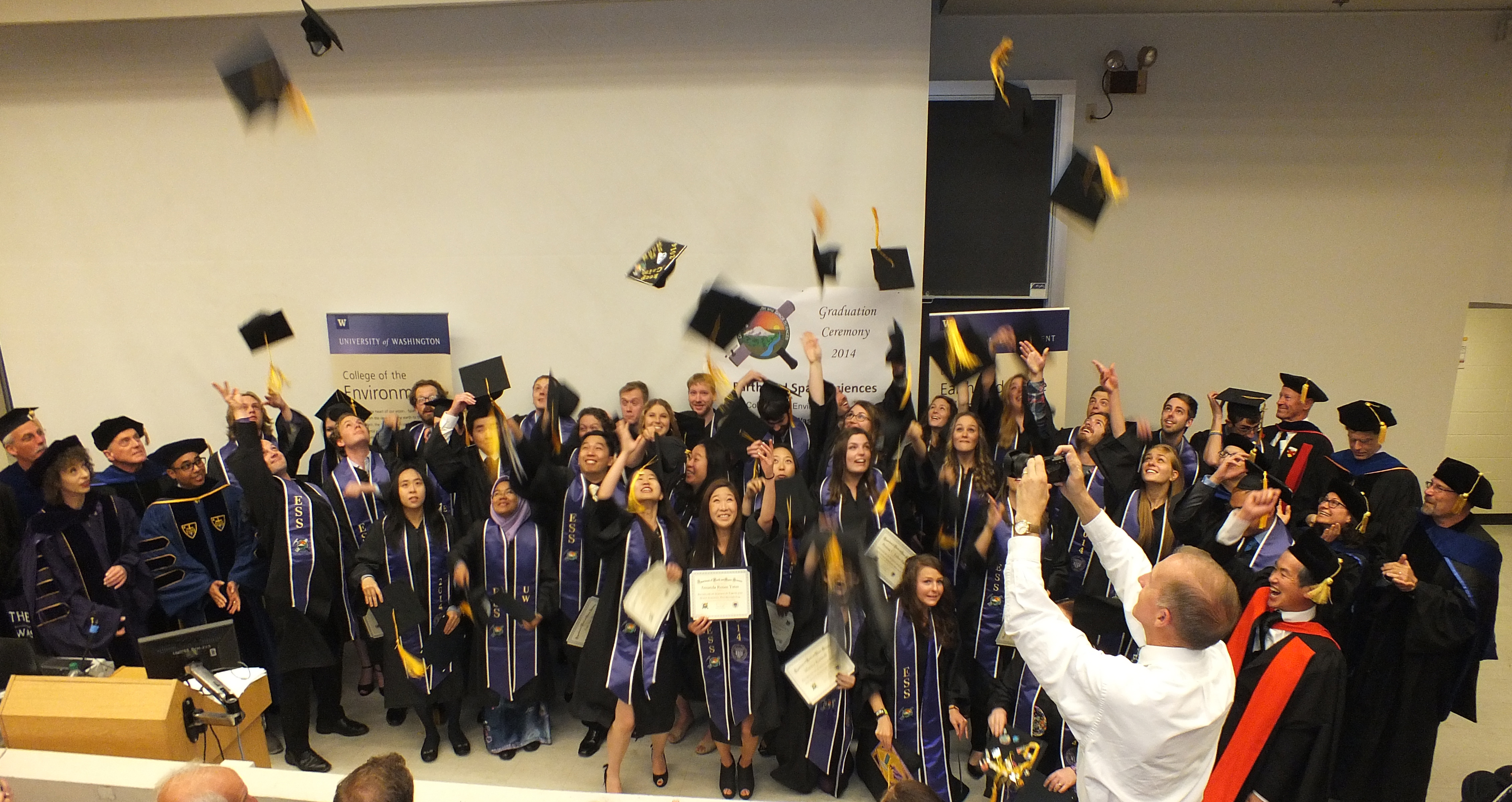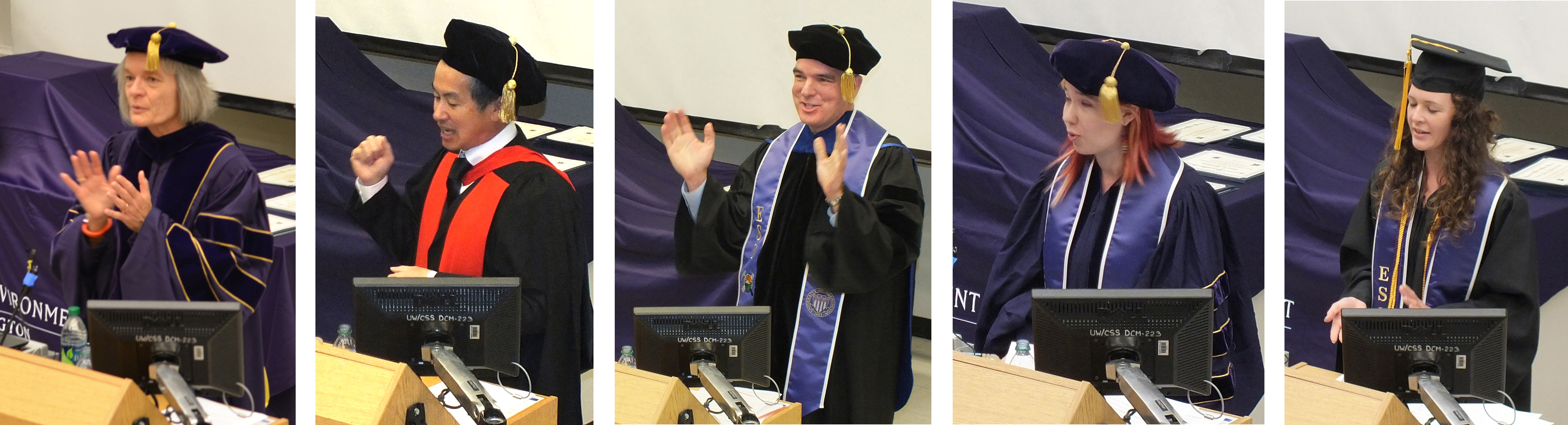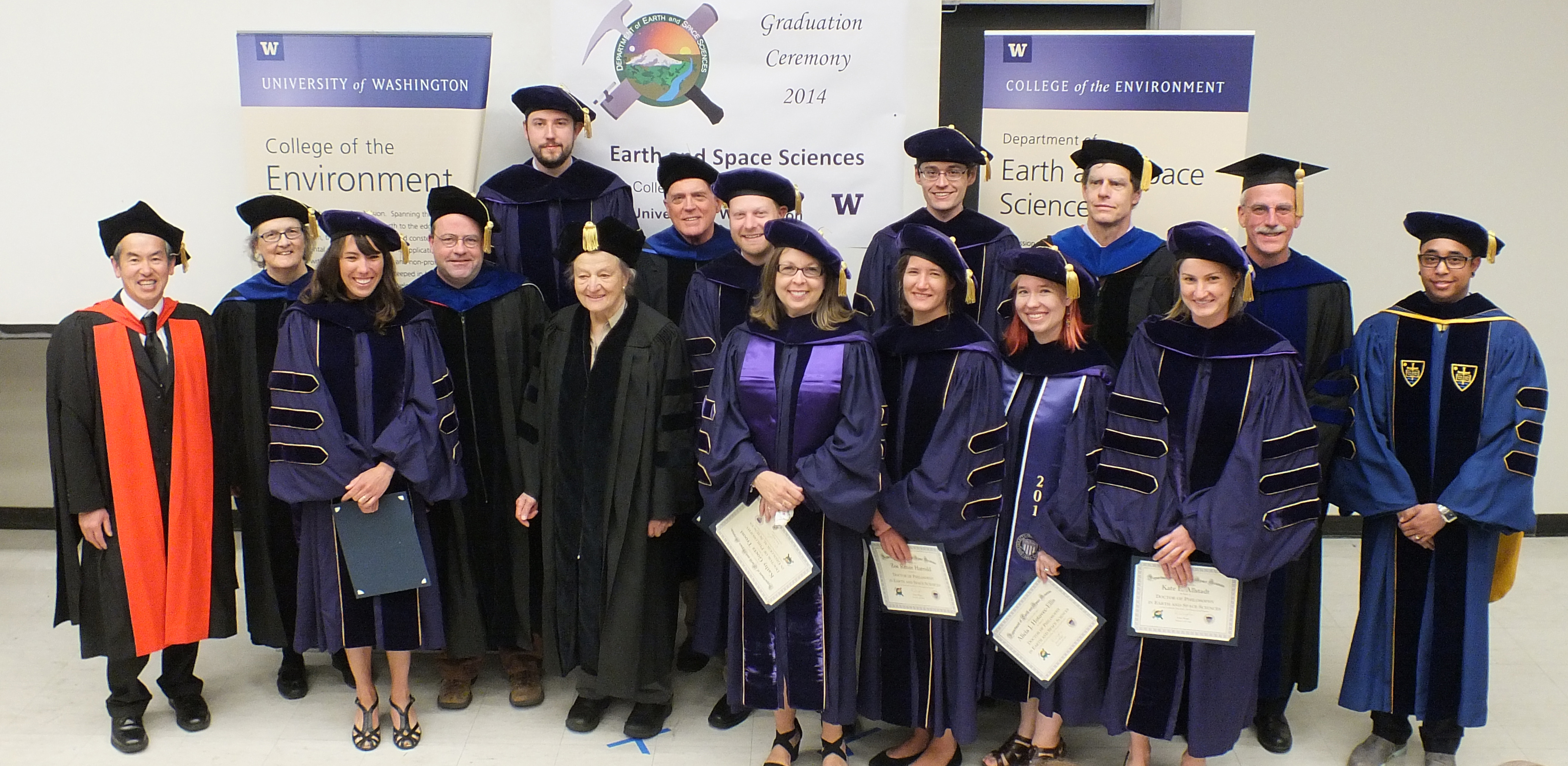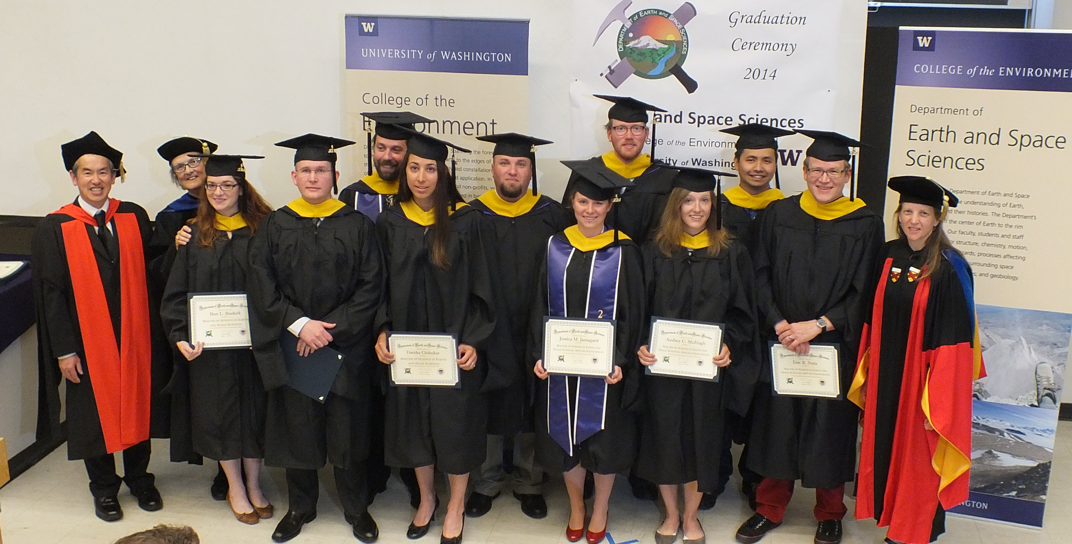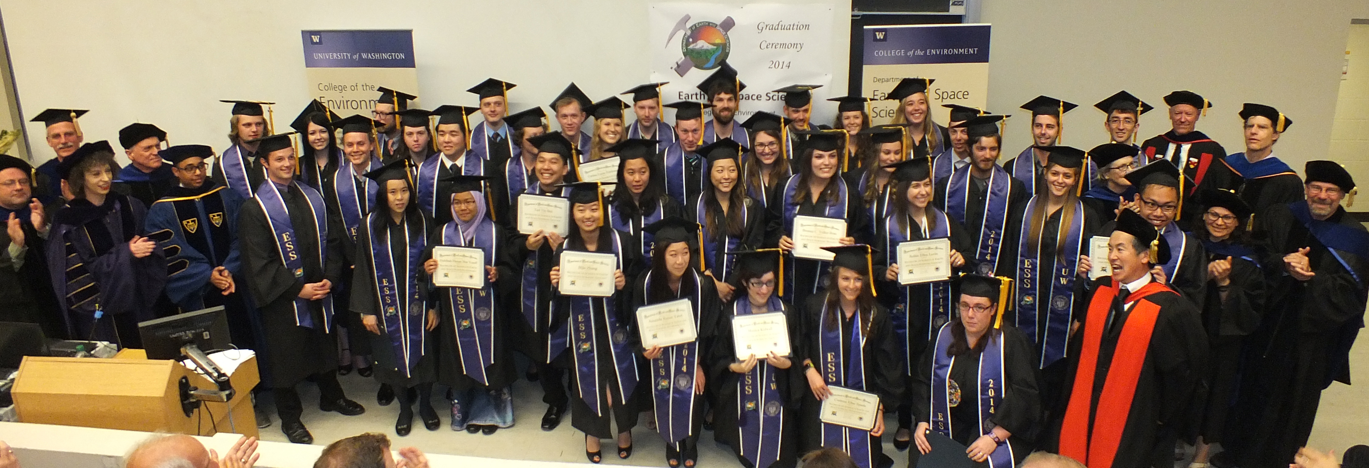 The 2014 Graduation Ceremony was hosted by Chair Robert Winglee, with College of the Environment Dean Lisa Graumlich, and special guest speaker Dr Erik Oswald (Undergrad UW Geology - '85), currently a VP with ExxonMobil Exploration Co, plus student speakers grad-student Alicia Hotovec-Ellis and undergrad Heather Bervid.
