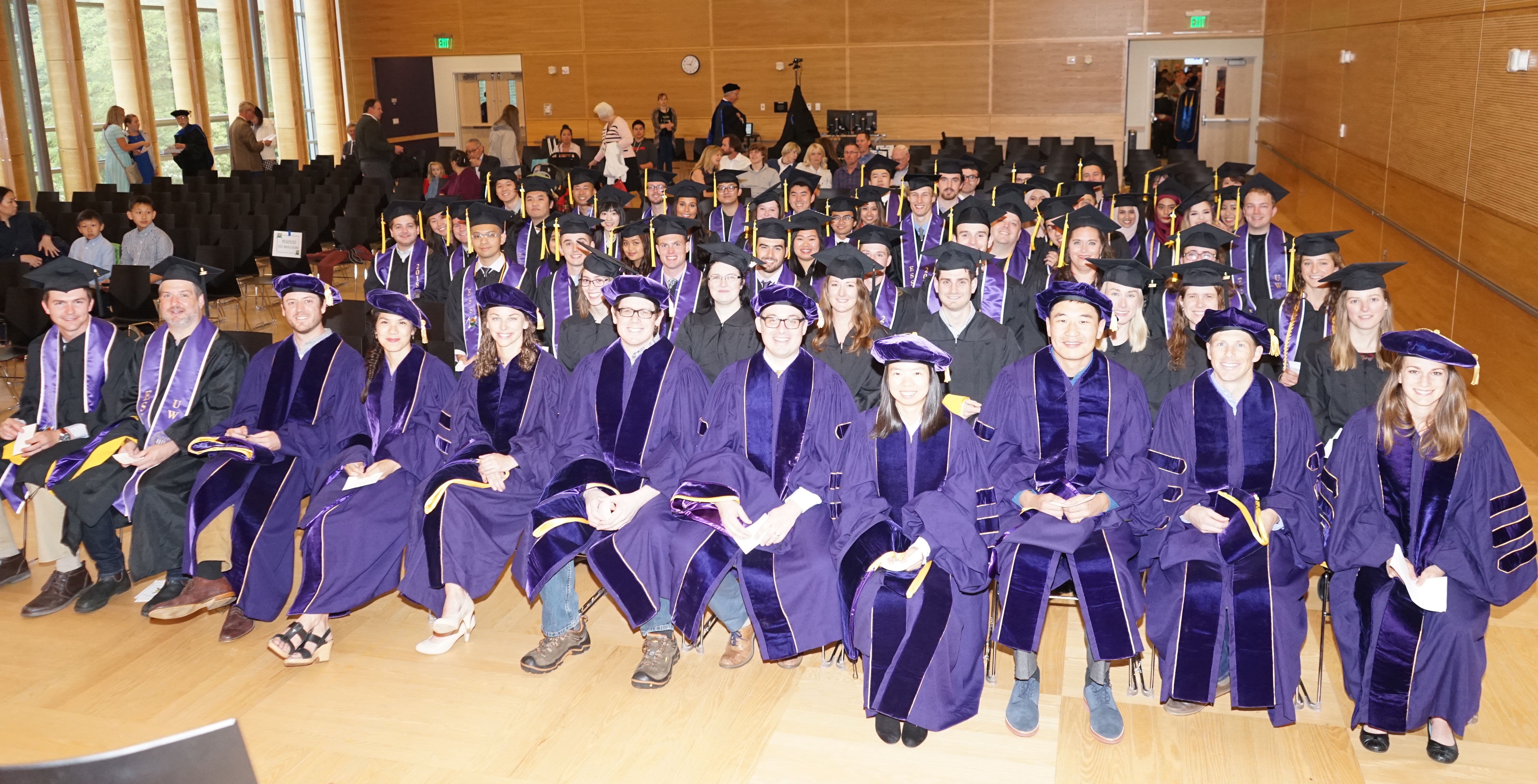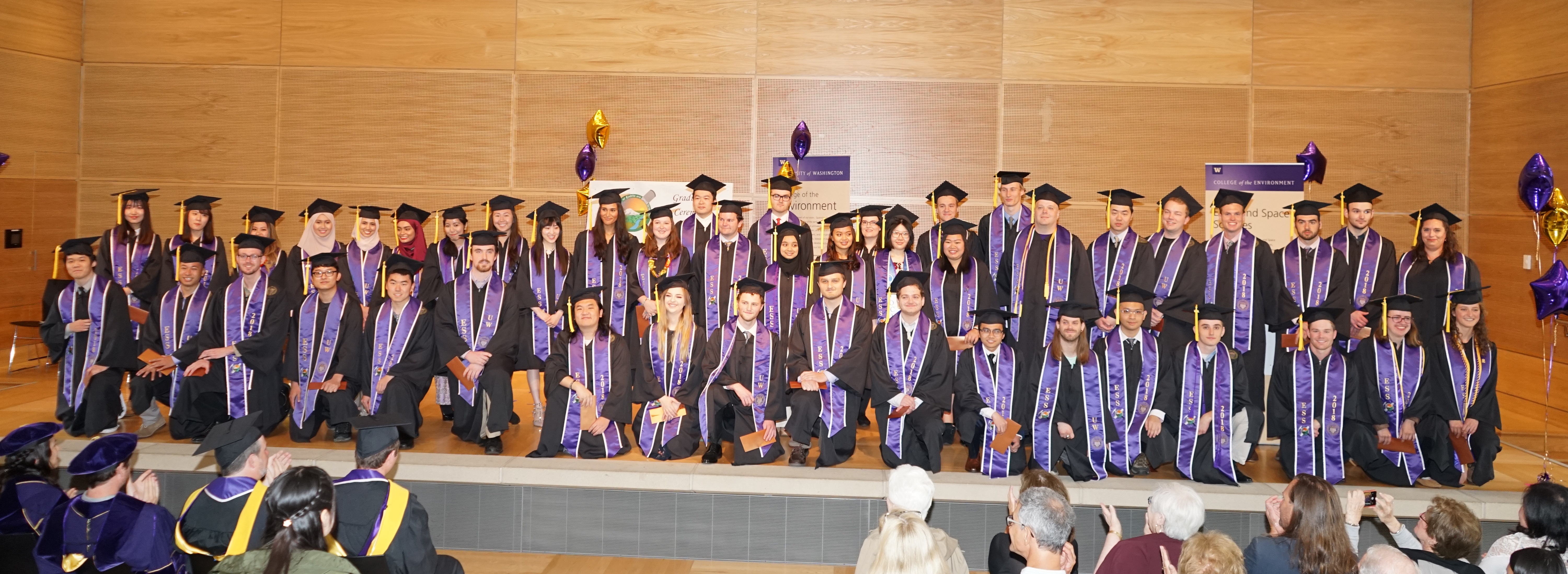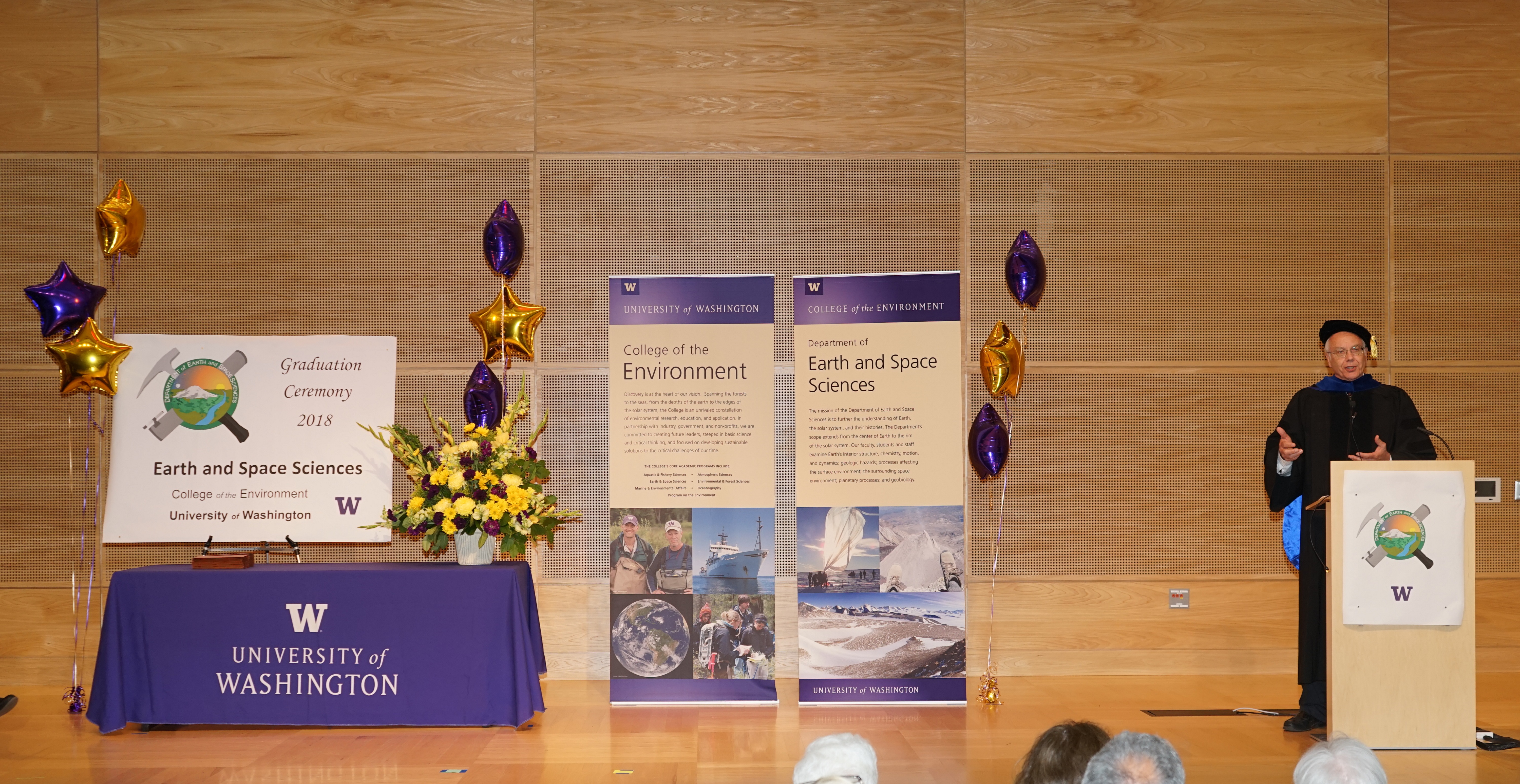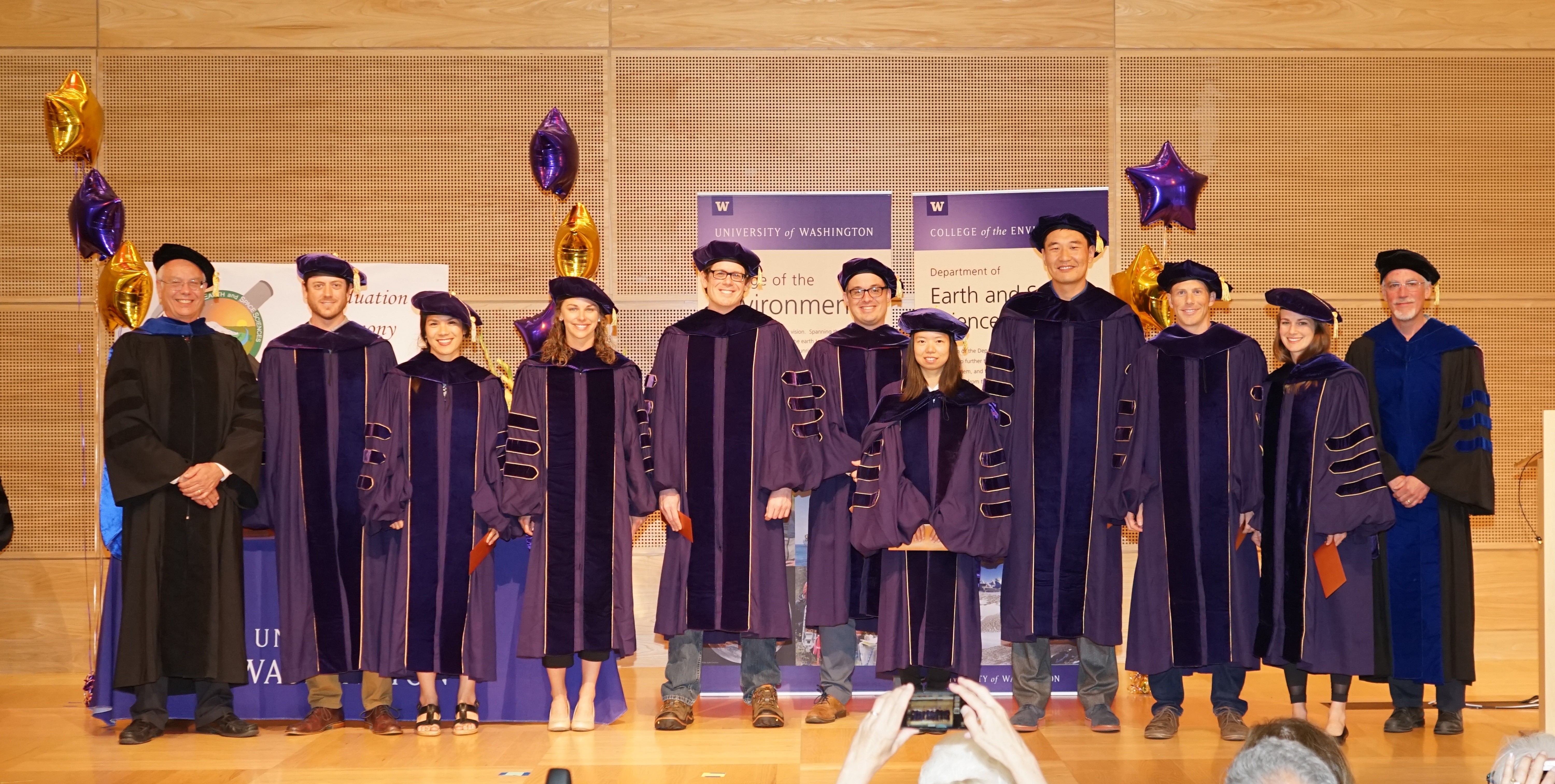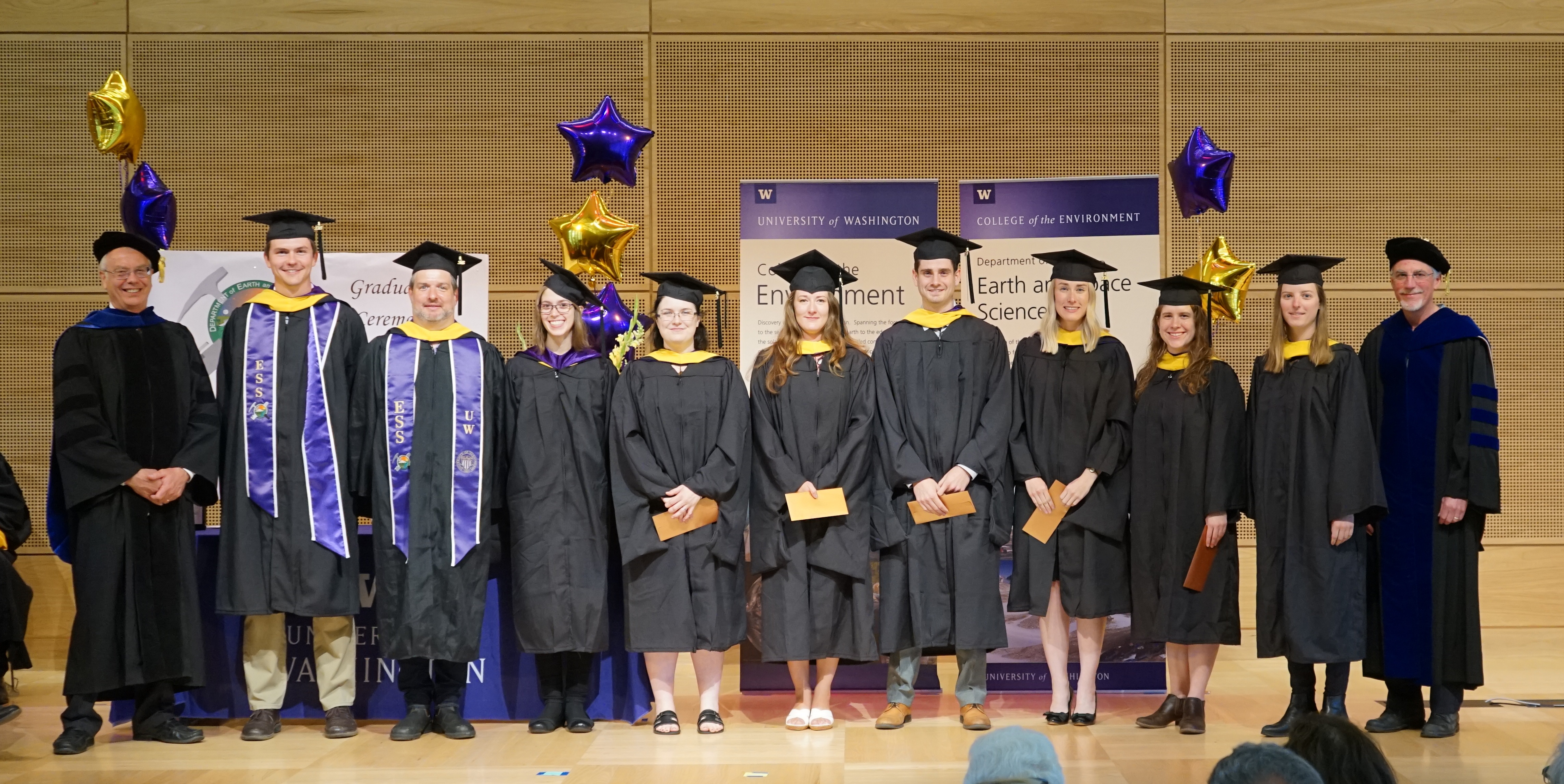 On Saturday June 9th, 2018, over 400 people gathered in the HUB Lyceum on the University of Washington Campus to celebrate the UW Dept of Earth and Space Sciences annual Graduation Ceremony, hosted by Chair Bruce Nelson. Receiving diplomas were 46 undergraduate students, out of a graduating class of 85. Receiving hoods were 9 out of a class of 12 Masters students, and 9 out of a class of 13 PhD students. This is one of our larger graduating classes so we again held the ceremony in the HUB Lyceum auditorium with seating for 400, as our previous locations in Johnson Hall and Bagley Hall are not adequate. In addition to the live audience, this ceremony was witnessed by 102 live videostreams to six countries around the world. A reception was held in the HUB Lobby outside the Lyceum following the ceremony.