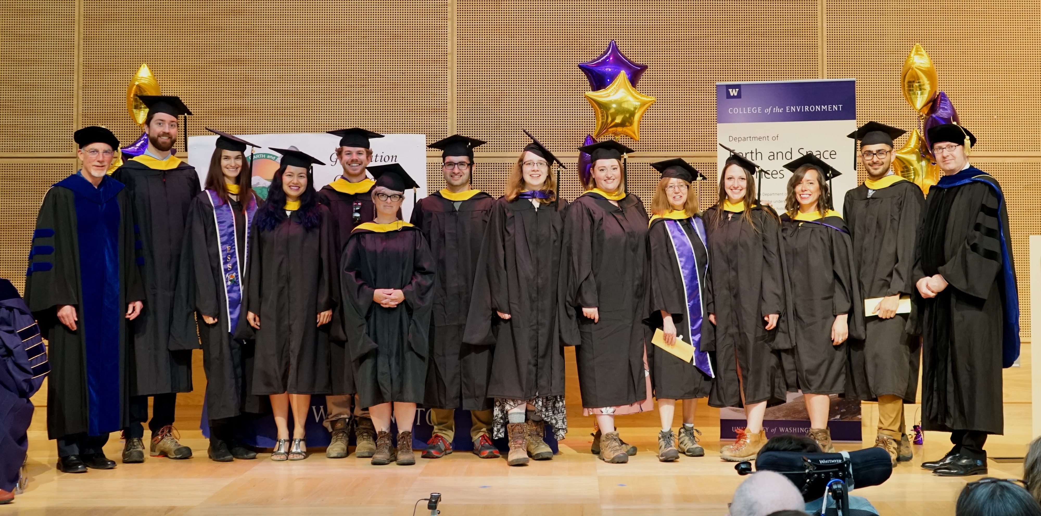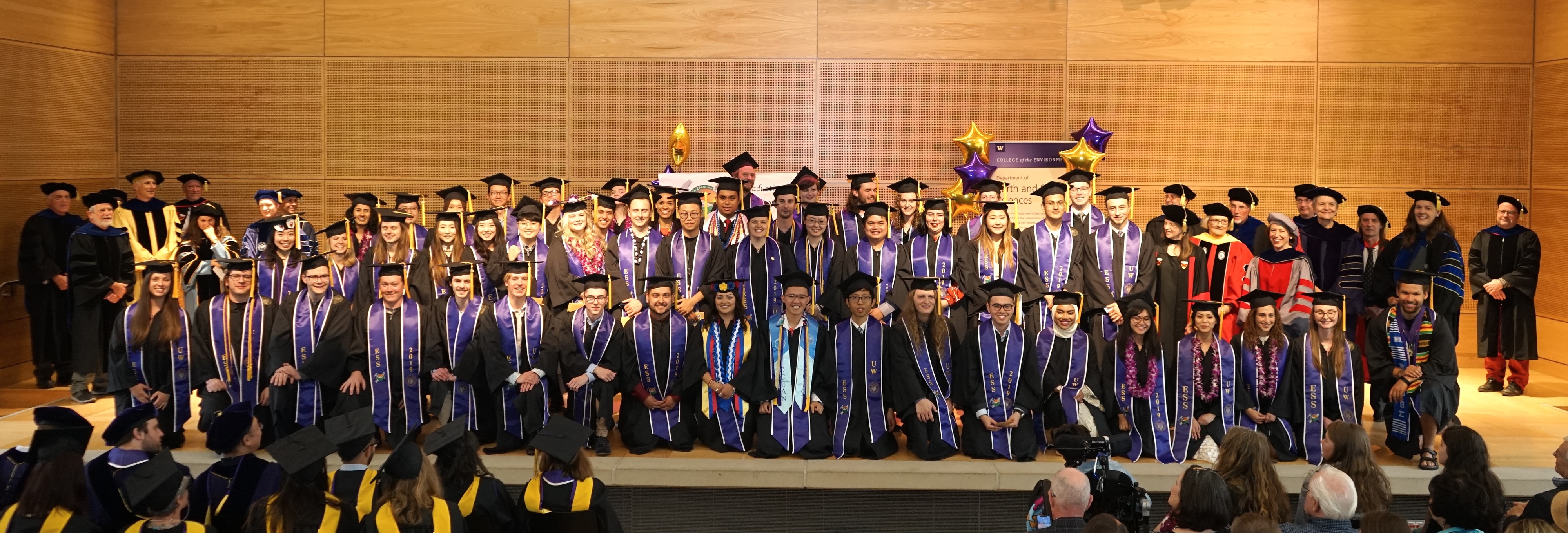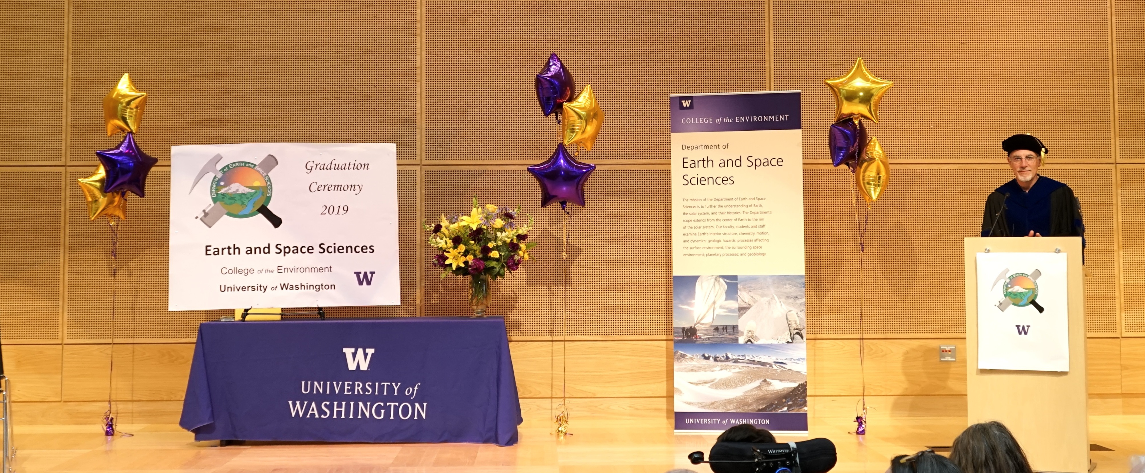 On Saturday June 15th, 2019, over 400 people gathered in the HUB Lyceum on the University of Washington Campus to celebrate the UW Dept of Earth and Space Sciences annual Graduation Ceremony, hosted by Chair Ken Creager. Receiving diplomas were 51 undergraduate students, out of a graduating class of 87. Receiving hoods were 12 out of a class of 13 Masters students, and 7 out of a class of 13 PhD students. This is one of our larger graduating classes so we again held the ceremony in the HUB Lyceum auditorium with seating for 400, as our previous locations in Johnson Hall and Bagley Hall are not adequate. In addition to the live audience, this ceremony was viewed by 70+ live videostreams to five countries around the world. A reception was held in the HUB Lobby outside the Lyceum following the ceremony.