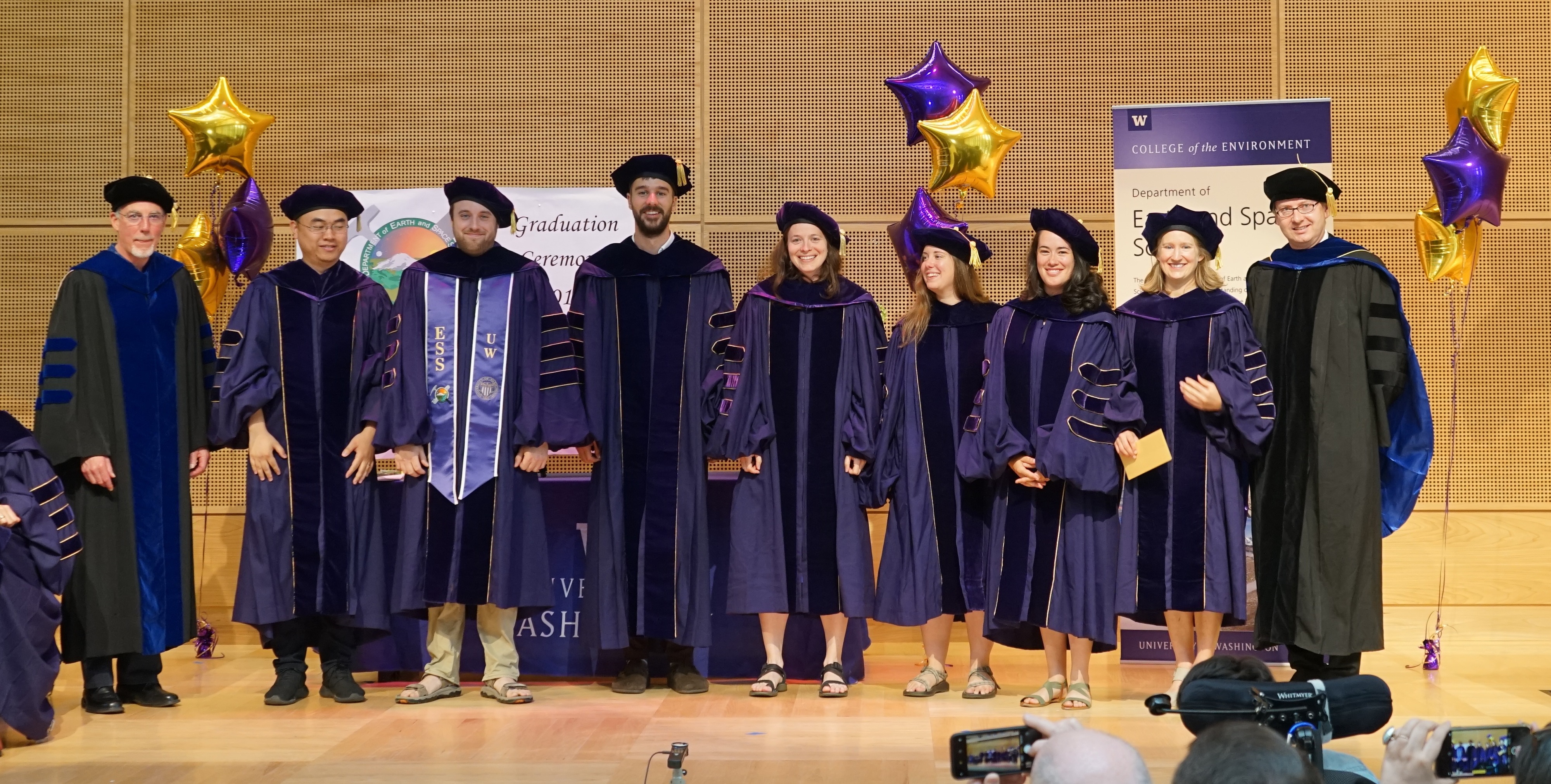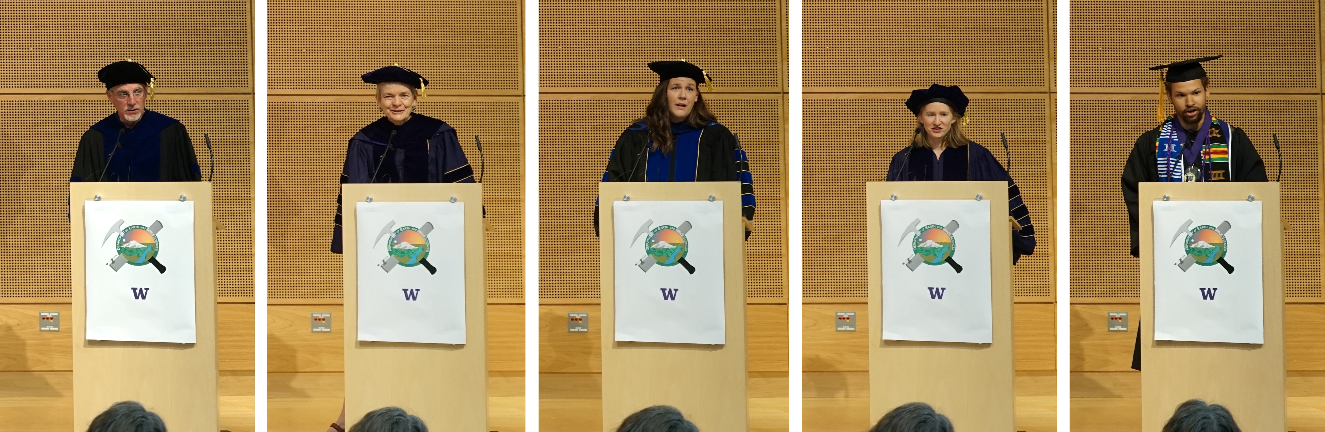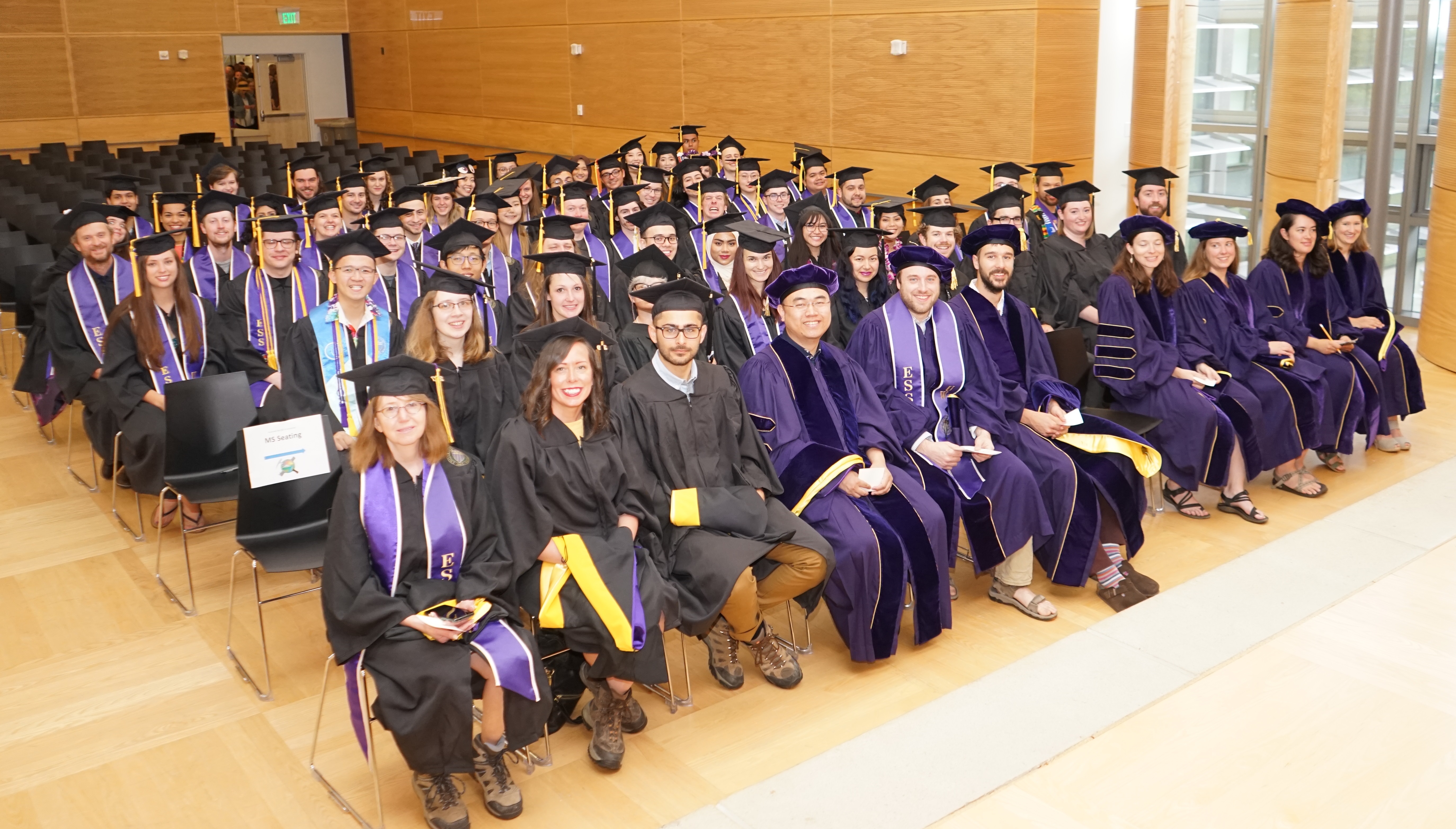 On Saturday June 15th, 2019, over 400 people gathered in the HUB Lyceum on the University of Washington Campus to celebrate the UW Dept of Earth and Space Sciences annual Graduation Ceremony, hosted by Chair Ken Creager. Receiving diplomas were 51 undergraduate students, out of a graduating class of 87. Receiving hoods were 12 out of a class of 13 Masters students, and 7 out of a class of 13 PhD students. This is one of our larger graduating classes so we again held the ceremony in the HUB Lyceum auditorium with seating for 400, as our previous locations in Johnson Hall and Bagley Hall are not adequate. In addition to the live audience, this ceremony was viewed by 70+ live videostreams to five countries around the world. A reception was held in the HUB Lobby outside the Lyceum following the ceremony.