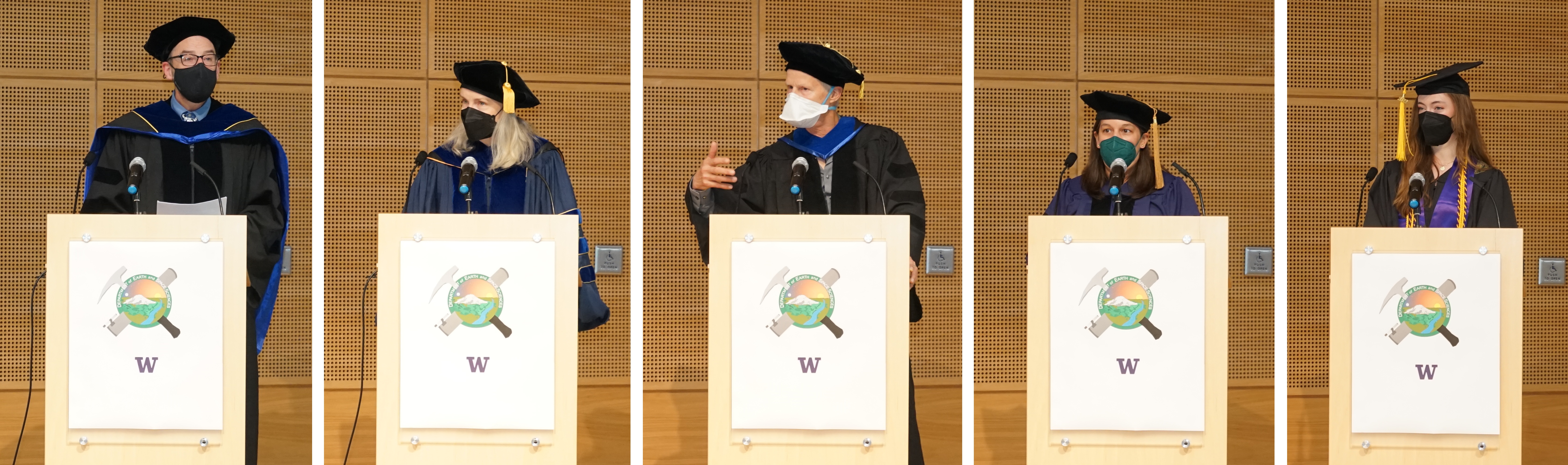 Speakers for the 2022 Graduation Ceremony include UW ESS Chair Eric Steig, UW College of the Environment Dean Maya Tolstoy, and special guest speaker Dr. Lee Fairchild (Ph.D UW 1985), currently working as a Geological Advisor and Reservoir Connectivity Specialist. Student speakers include Taryn Black for the grad students, and McKenzie Carlson for the undergraduate students.